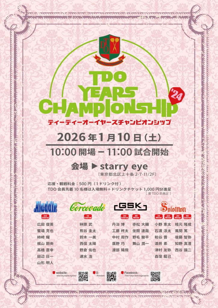 今週末1月10日(土)はTDOイヤーズチャンピオンシップ’24がstarry eyeにて開催されます!